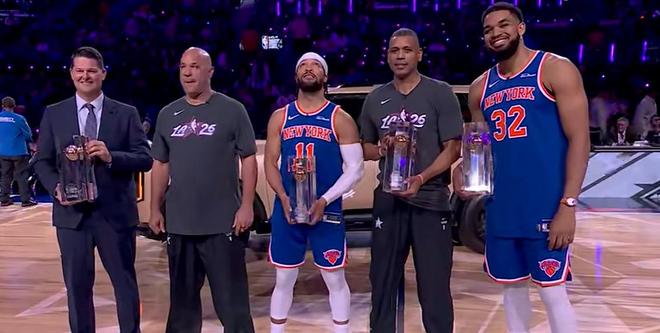 篮球直播站2月15日报道:NBA全明星周末进入第二天,在投篮之星比赛里,由布伦森、唐斯和阿兰-休斯顿组成的尼克斯队轻松夺冠。在决赛里马盖蒂虽然连进超远三分帮助队伍拿到38分,但