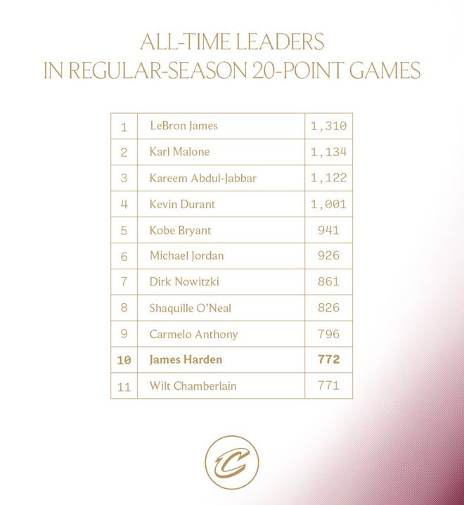 这场比赛哈登迎来里程碑,他完成772次20+升至历史第10,排在他身前的安东尼是796场。