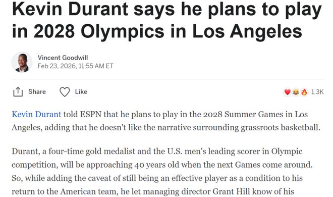 并且杜兰特完全没有老迈与下滑的势头,在接受ESPN记者Vincent Goodwill采访时更是公开表示自己计划参加2028年的洛杉矶奥运会。