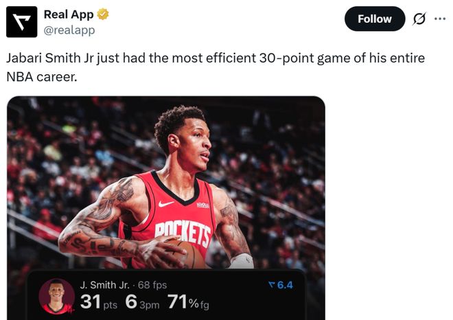 37岁杜兰特延续火热进攻状态,只不过,由于身旁队友状态火爆,加上对手竞争力相对有限,杜兰特并没有发力,全场仅出手13次,命中其中7球,三分更是6中4,高效拿下18分5板1断1帽的同时,还送出了火箭生涯新高的12次助攻,正负值+28全场第一。