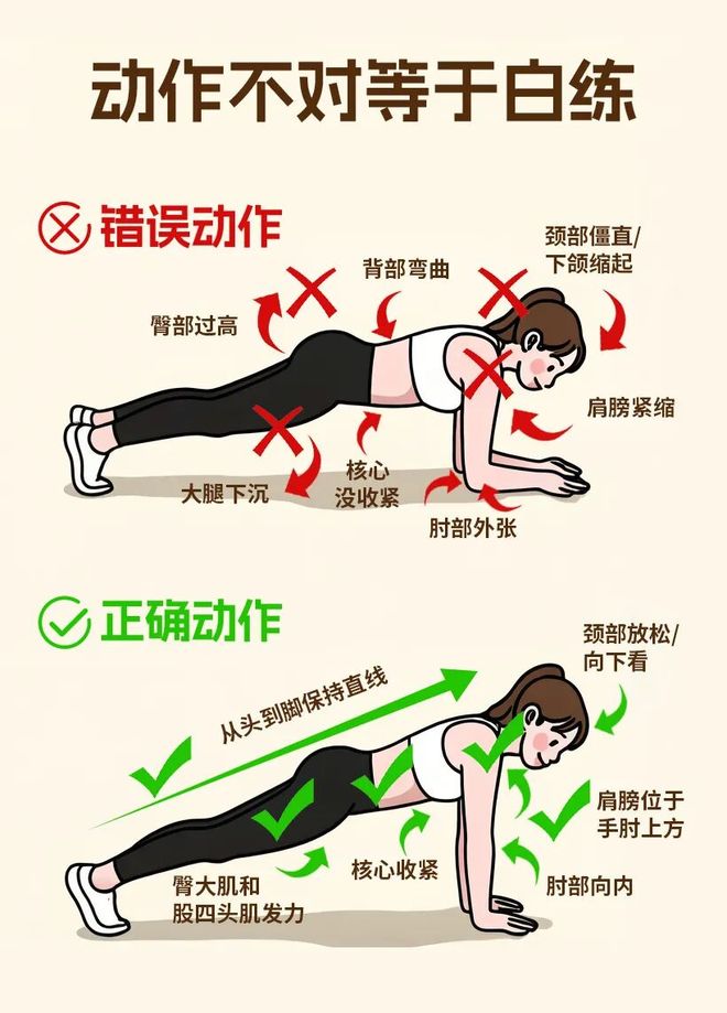 在做平板支撑时,要避免腰部下沉或臀部抬得过高,这会显著增加腰椎压力。避免刻意追求时长,当动作变形时应立即停止——质量永远优于数量。避免屏气,保持均匀呼吸,否则会导致肌肉快速疲劳。