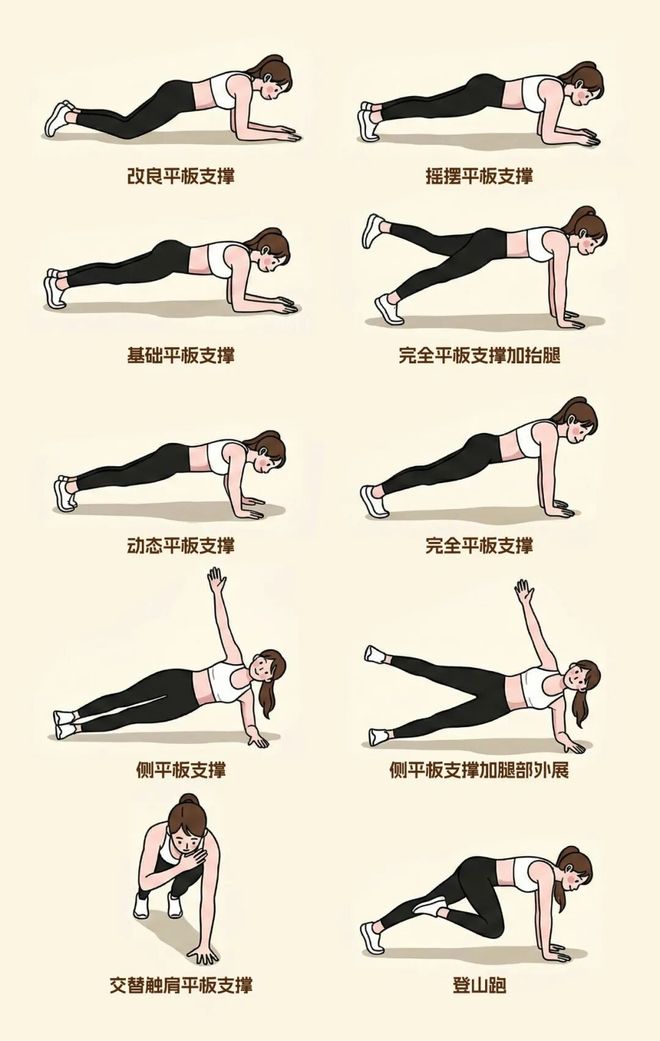有专业教练指出:“平板支撑好的人,不一定跑得快,但平板支撑差的人,一定跑不快”。头、肩、胯、踝保持一条直线,腹部收紧,呼吸平稳,然后再加入变式动作跟随音乐拍肩、拍手、肘部着地
