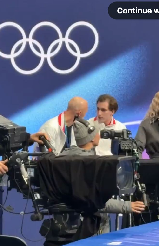 镜头切到kiss and cry区域,这是运动员完成比赛后,和教练一起坐着等待裁判打分的地方。Benoît穿着美国队的队服,坐在一个年轻人身边。