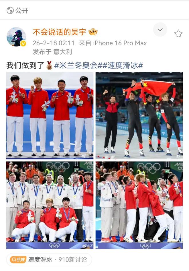 北京时间2月17日,在米兰-科尔蒂纳冬奥会速度滑冰男子团体追逐比赛中,由刘瀚彬、吴宇、李文淏、宁忠岩组成的中国队,以3分41秒38的成绩战胜荷兰队夺得铜牌!创造了中国队在速度滑冰男子团体追逐项目冬奥会历史最好成绩!