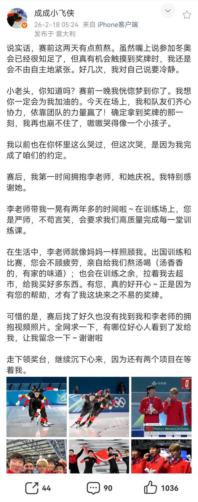 刘瀚彬发长文称:“说实话,赛前这两天有点煎熬。虽然嘴上说参加冬奥会已经很知足了,但真有机会触摸到奖牌时,我还是会不由自主地紧张。好几次,我对自己说要冷静。……走下领奖台,继续沉下心来,因为还有两个项目在等着我。”