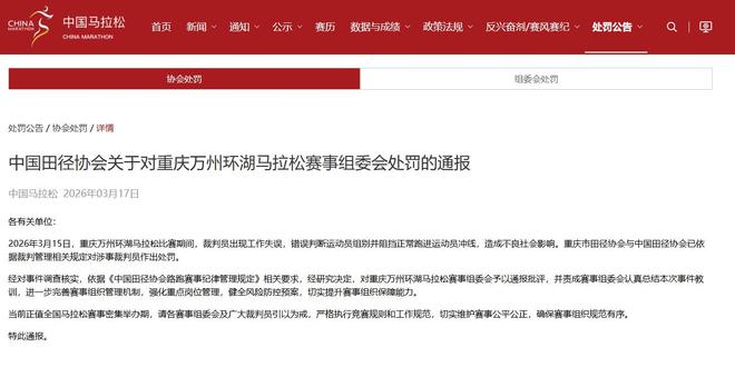 新京报讯 3月17日,中国马拉松官网发布中国田径协会对重庆万州环湖马拉松赛涉事裁判、赛事组委会处罚的通报。全文如下: