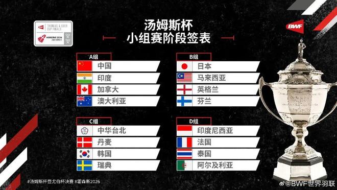 2026年汤姆斯杯暨尤伯杯决赛圈即将在4月底在丹麦城市霍森斯进行,世界羽联今天下午进行了线上抽签,本届汤杯和尤杯各16支参赛队伍小组赛分组全部出炉。作为双杯卫冕冠军,中国队