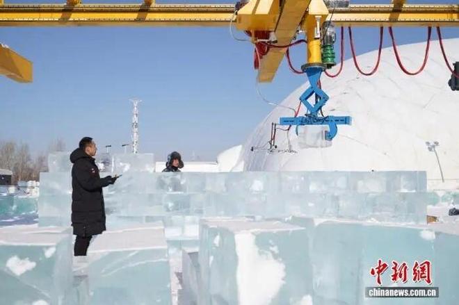 2月3日,在第二十七届哈尔滨冰雪大世界的“科技赋能冰雪实验区”内,智能自动化标准冰砌块生产线已初步形成,从冰块切割塑型到自动搭建均进入现场测试阶段。中新社发 赵宇航 摄