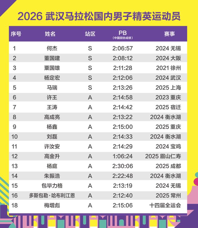 从赛会公布的名单看,三代武汉马拉松男子国内赛会纪录创造者将同场竞争,他们分别是:2019年的董建国(2:12:34)、2024年的杨定宏(2:12:06)以及去年的何杰。