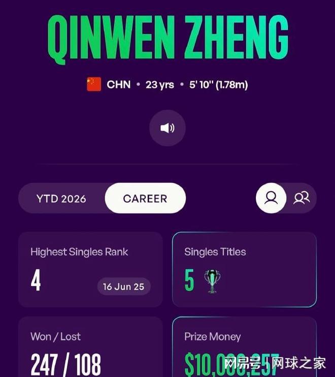 尽管是一名年轻的零零后球员,郑钦文在2020年才开始在成人赛场展露头角,但是在本周她的职业生涯奖金已经正式突破1000万美元,达到了10000257美元,目前正式位居中国网协的第三名。