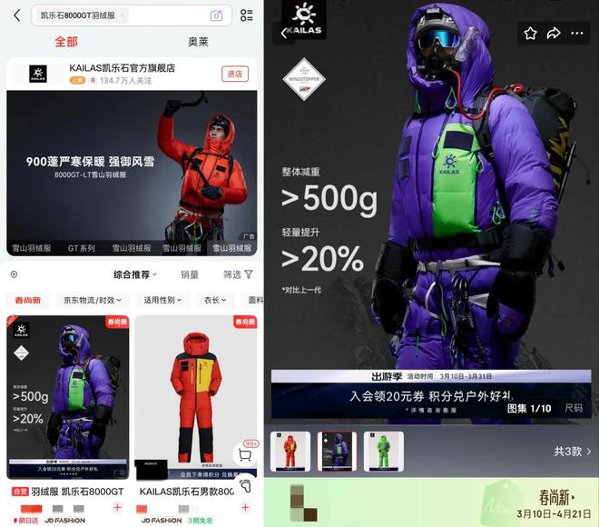 例如凯乐石8000GT羽绒服,为探险珠峰设计,能扛住-40℃极寒、280km/h暴风,并且耐磨、防刺。有这类产品需求的人无疑少之又少,而负责人表示,“专业级产品线和专业护具,只有京东能卖出去。”这也说明了,用户契合度高背后,不仅指普通爱好者或户外老炮,也涵盖了更专业、更小众的人群。