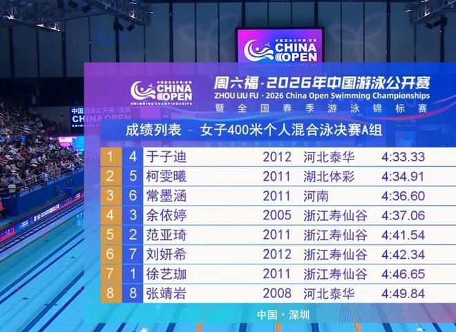 13岁的于子迪凭借这个成绩成为全国历史上在400米混合泳第四快的选手。叶诗文4分28秒43第一,李玄旭4分30秒43第二,齐晖4分30秒85第三。
