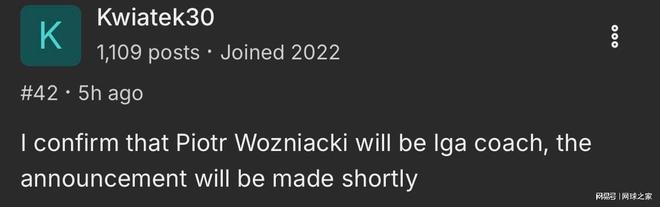 近期,一位曾准确预测斯瓦泰克解雇维克托罗夫斯基、并聘请费塞特接任的消息源称,这位波兰选手即将与皮奥特·沃兹尼亚奇合作。皮奥特曾将女儿卡洛琳执教至女子单打世界第一,并助其夺得2018年澳网冠军。