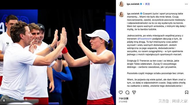今晚,斯瓦泰克无预警官宣结束与教练费塞特的合作,在声明中写道:“有时候,人生和体育总会带来这样的时刻……迈阿密这站比赛对我而言充满挑战。我当然感到失望、苦涩,也为自己在场上的表现承担责任。与此同时,我也学到了许多重要的一课,我认为这是人之常情。话虽如此,在与我的教练维姆·费塞特共事数月之后,我决定选择一条不同的道路。那段时光紧张而充实,充满挑战,也收获了许多宝贵的经历。我感谢他的支持、他的经验,以及我们共同取得的一切成就——其中包括我在体育生涯中最大的梦想之一。”