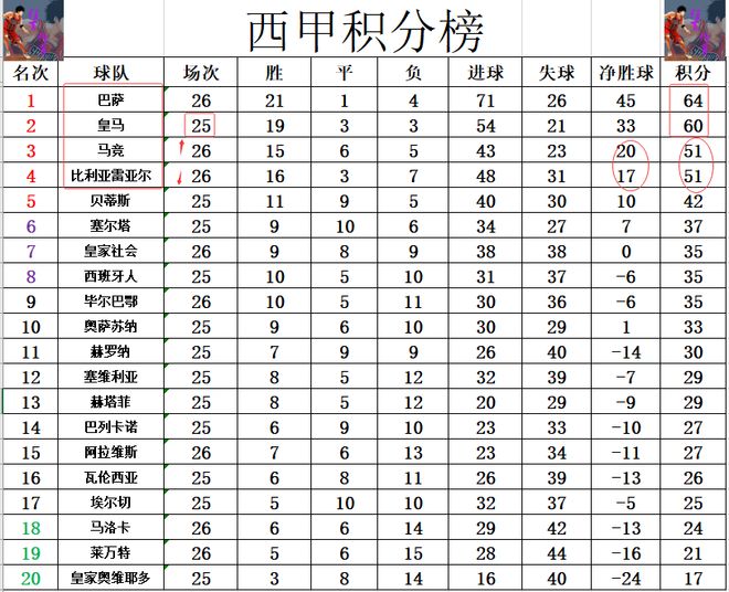 西甲最新积分战报巴萨大胜多皇马4分继续领跑马竞小胜冲进前3