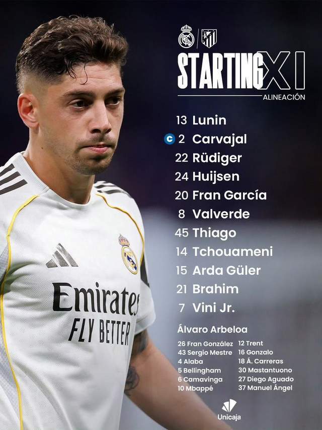 皇马首发:库尔图瓦伤了,罗德里戈伤了。经过调整,阿贝罗亚做出新改变,门将是卢宁,后防线:队长卡瓦哈尔和弗兰·加西亚打两个边后卫,吕迪格、赫伊森组成双中卫。前场:巴尔韦德、居莱尔打两个边前卫,小将皮塔奇和楚阿梅尼打双后腰。卜拉欣·迪亚斯和维尼修斯组成前锋。