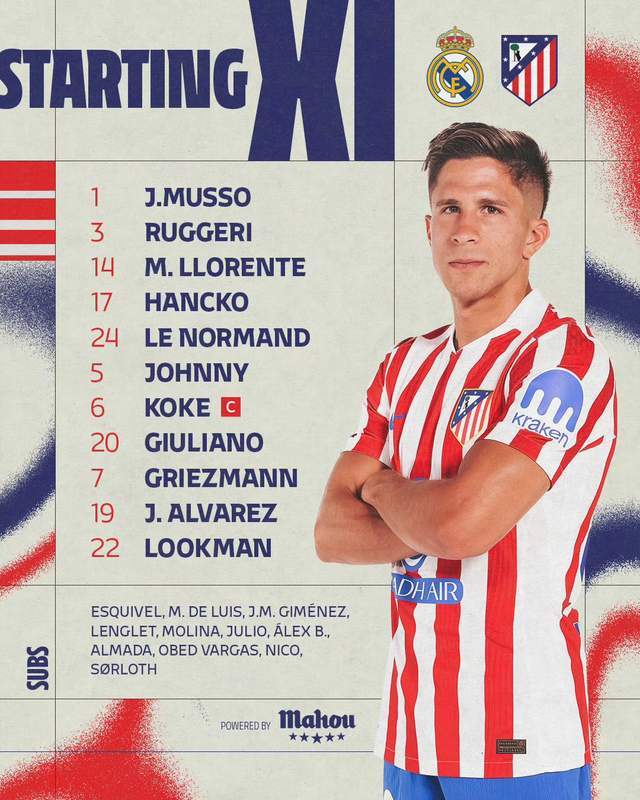 马竞同样是标准的442,门将穆索。后防线:鲁杰里、马科斯·略伦特打两个边后卫,汉茨科、勒诺尔芒组成双中卫。前场:卢克曼、小西蒙尼打两个边前卫,队长科克和卡多佐组成双后腰。前锋是格列兹曼和阿尔瓦雷斯。