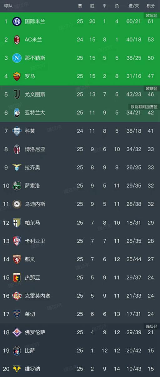 意甲第25轮所有比赛结束,最新积分榜如下!