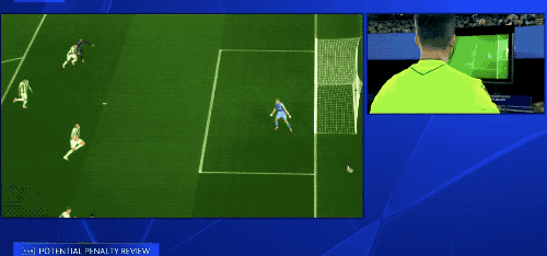 VAR介入,特里皮尔的犯规清晰可见,裁判吹罚点球,并给了特里皮尔一张黄牌。