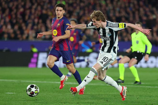 比分落后的纽卡斯尔毫不示弱,在左路打出流畅配合,巴萨防线明显漏人,伊兰加反向跑动中的射门,扳平比分。