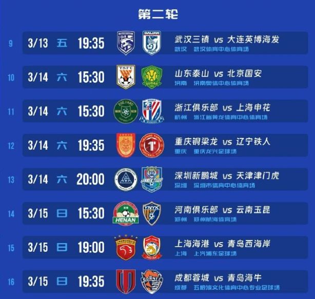 3月6日,中超揭幕战将在成都进行,成都蓉城将主场对阵深圳新鹏城,首次为成都蓉城出场的拜合拉木就将对阵老东家。辽宁铁人、重庆铜梁龙分别客场对阵山东泰山、天津津门虎,这将是两支球队的中超处子秀。