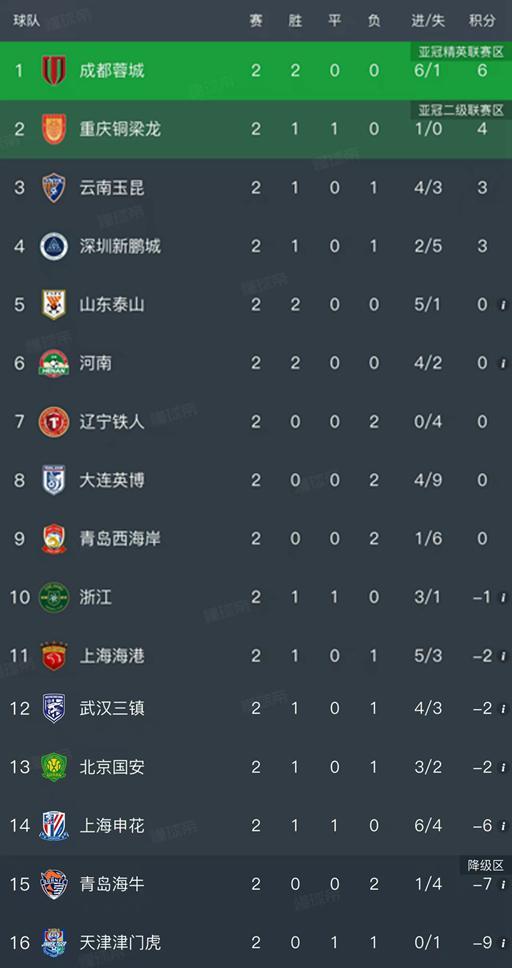 北京时间3月16日,昨天随着成都蓉城1-0青岛海牛,上海海港4-1大胜青岛西海岸,中超第二轮结束了所有比赛,我们看看最新积分榜变动!